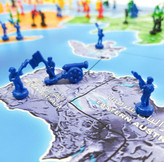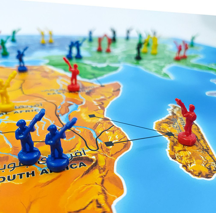 صفحه بازی رومیزی Risk بازیمن ریسک تصویری از نقشه سیاسی جهان است که به 42 قلمرو مختلف در 6 قاره تقسیم شده و بازیکنان باید به قلمروهای دیگر حمله کنند تا بتوانند آنها را تصاحب کنند.